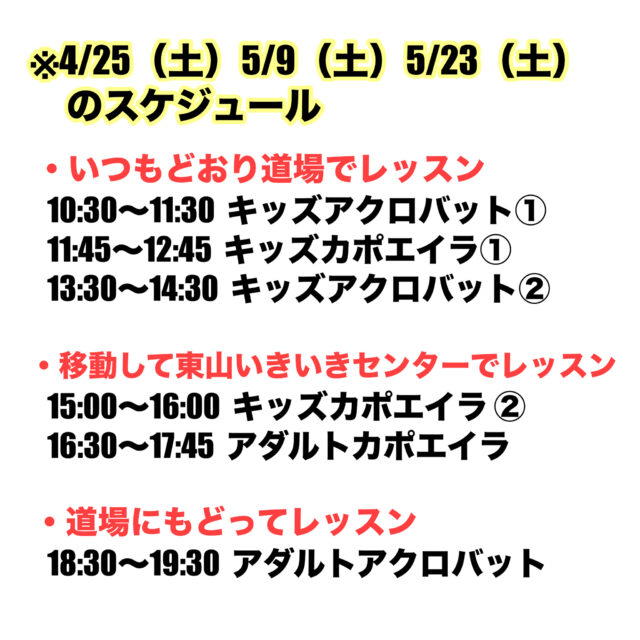 ※5/9(土)と5/23(土)も東山いきいきセンターでレッスンを行う予定ですが、今週の4/23(土)分から10:30〜14:30のクラスまでは通常通り道場で行います。
